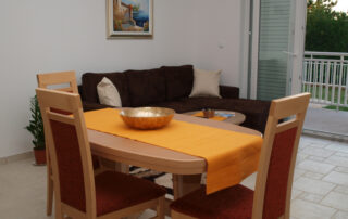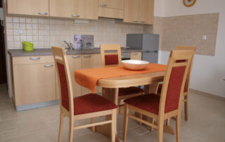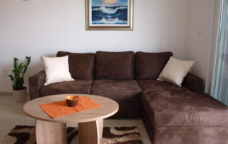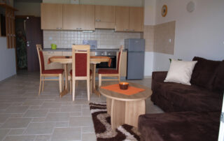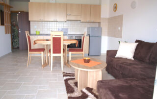 Kitchen and living room: The living room includes a large three-seat sofa convertible to a bed for two adults or children. A large wall-mounted 32” LCD full HD TV set is available for Croatian and Slovenian channels as well as for many international channels broadcast by satellite.