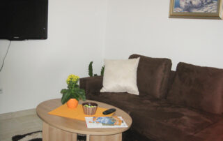Kitchen and living room: The living room includes a large three-seat sofa convertible to a bed for two adults or children. A large wall-mounted 32” LCD full HD TV set is available for Croatian and Slovenian channels as well as for many international channels broadcast by satellite.